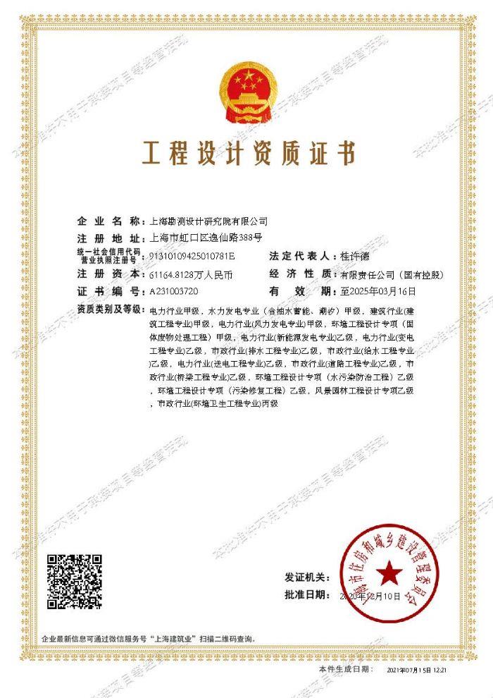 工程設(shè)計(jì)資質(zhì)證書:建筑行業(yè)(建筑工程專業(yè))甲級;環(huán)境工程設(shè)計(jì)專項(xiàng)(固體廢物處理工程)甲級;