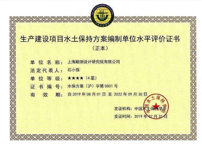中國水土保持協(xié)會生產(chǎn)建設項目水土保持方案編制水平評價證書4星