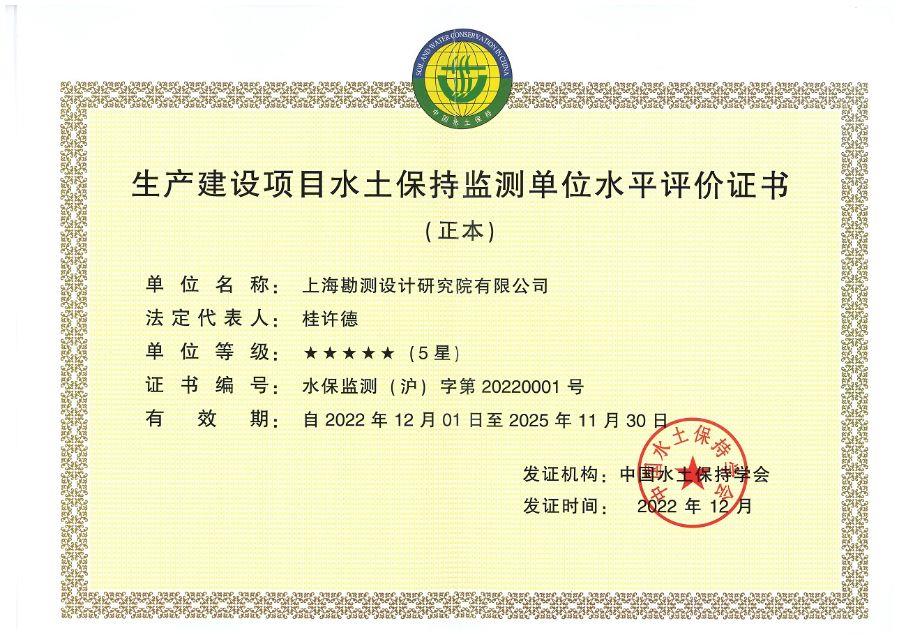 中國(guó)水土保持協(xié)會(huì)生產(chǎn)建設(shè)項(xiàng)目水土保持監(jiān)測(cè)單位水平評(píng)價(jià)證書(shū)5星